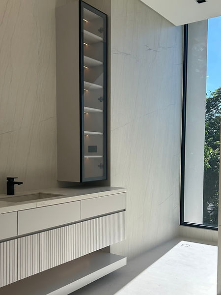 Baño concebido como un refugio de lujo, donde la chapilla lacada en tono claro envuelve el espacio con luz, suavidad y una sensación de calma sofisticada.