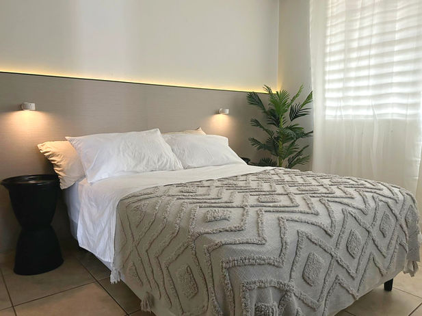 Habitación diseñada con paleta neutra e inspiración tropical, pensada como un oasis de descanso. La iluminación LED integrada en el backing de la cama refuerza una atmósfera de calma y paz al llegar a casa.